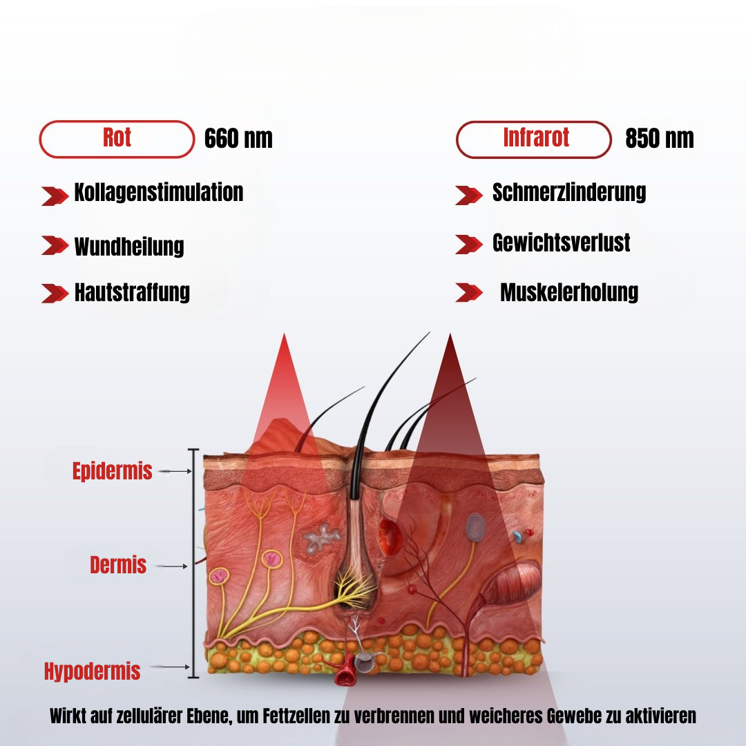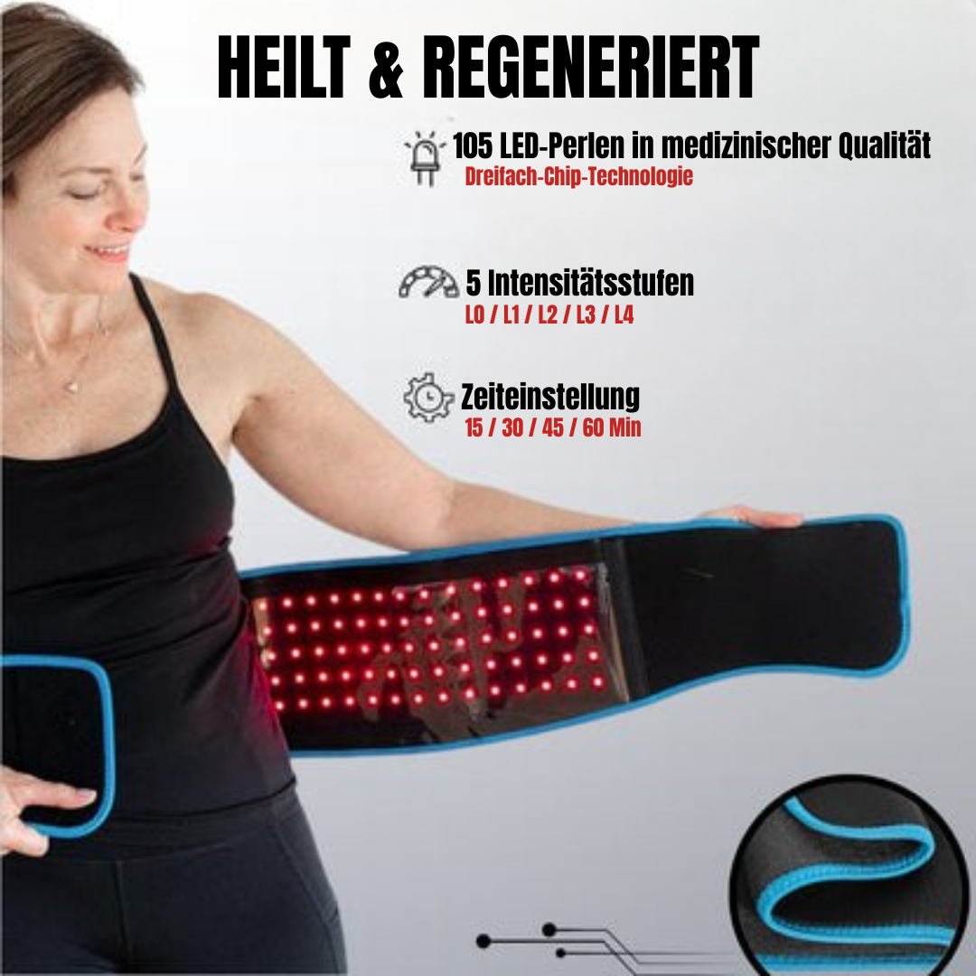 Der Luminora™ Rotlicht-Therapiegürtel nutzt Infrarotlicht, um tief einzudringen, die zelluläre Energieproduktion zu stimulieren und natürliche Heilungsprozesse von innen zu fördern.